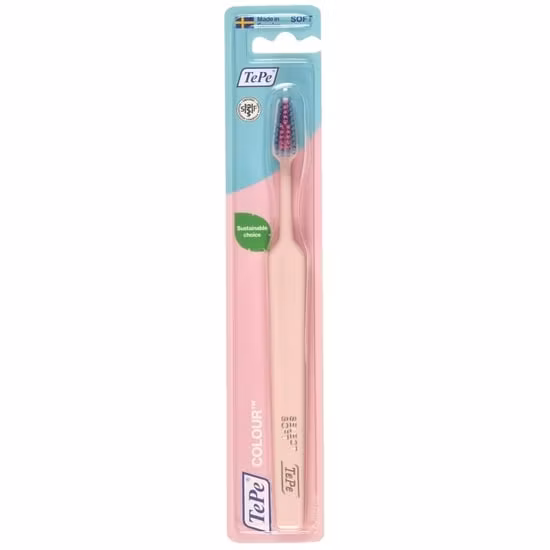 TePe Colour Soft is a simple and user-friendly toothbrush that can be used by adults and teenagers. The toothbrush has a tapered brush head for easy access, and the rounded soft bristles provide gentle cleaning. The handle can be angled if you warm it up in warm water.