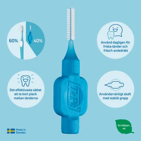 By replacing fossil raw materials with fossil-free pine oil, TePe has reduced the carbon footprint of its interdental brushes by 80%, without compromising product quality or effectiveness. The interdental brushes are manufactured in Sweden using green energy.