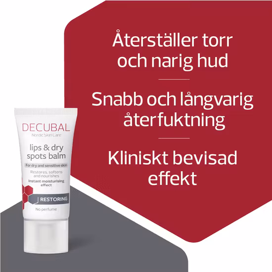Decubal Restoring Lips & Dry Spots Balm är en vattenfri och närande salva med kliniskt bevisad snabb och långvarig återfuktande effekt. Lips & Dry Spots kan användas till mindre hudpartier där huden är torr och narig, och till t ex spruckna läppar, trasiga nagelband och torra armbågar. Decubal Lips & Dry Spots Balm innehåller bivax, antioxidanten E-vitamin och det naturliga fettet lanolin som mjukgör, ger näring åt och hjälper till att återställa torr hud. Passar även känslig hud. Salvan är oparfymerad.